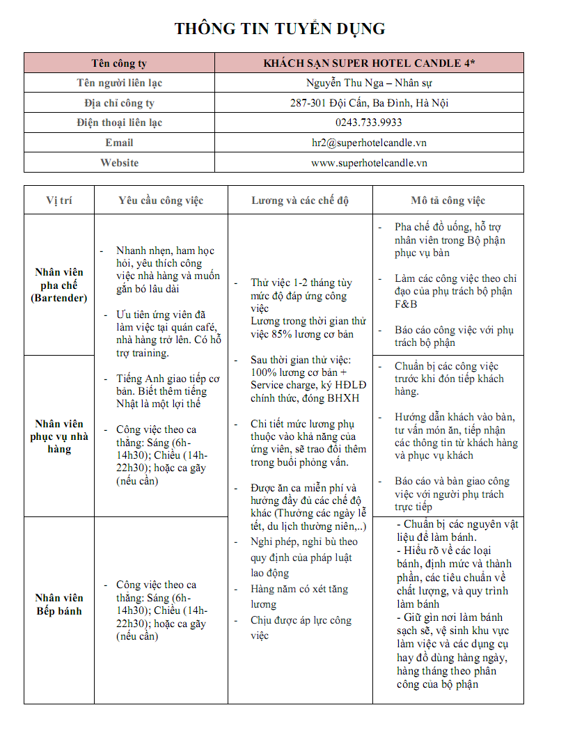 Khách sạn Super Hotel Candle 4* Tuyển dụng