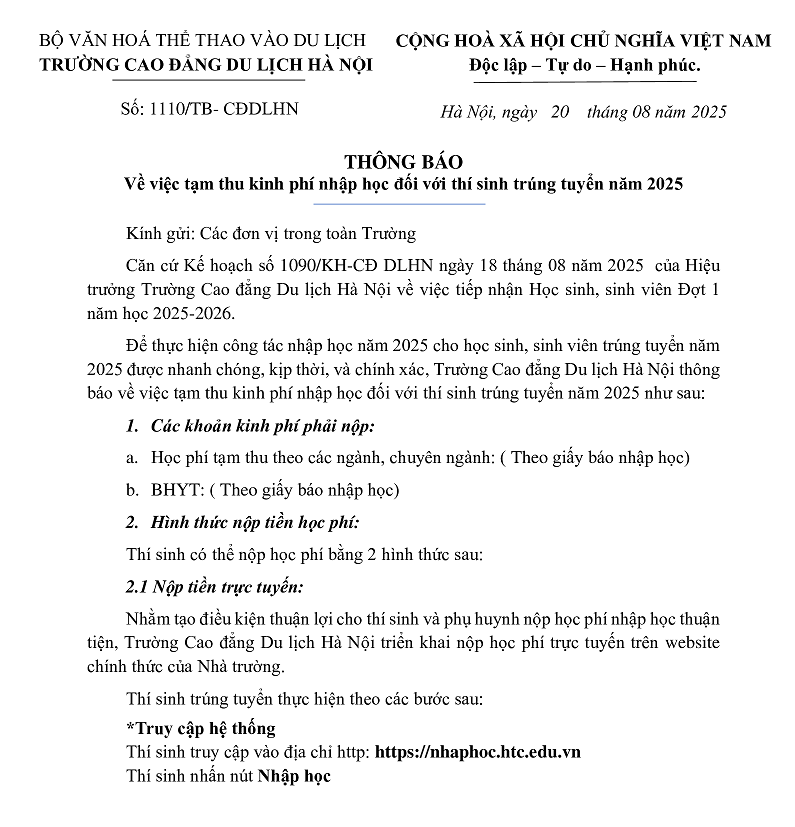 Trường Cao đẳng Du lịch Hà Nội thông báo tới tân sinh viên trình độ Cao đẳng khóa C22 và tân học sinh trình độ Trung cấp khóa K28 nội dung phân lớp như sau: