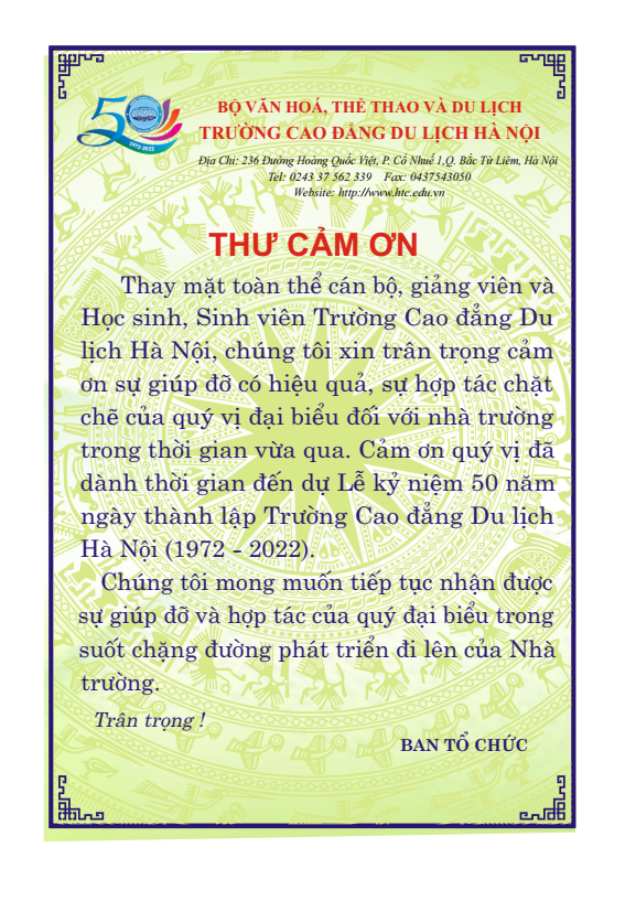 Ngày 15/11, Trường Cao đẳng Du lịch Hà Nội tổ chức lễ kỷ niệm 50 năm thành lập. Trường Cao đẳng Du lịch Hà Nội tiền thân là cơ sở đào tạo đầu tiên của Tổng cục Du lịch, với sự lớn mạnh, nhà trường đã và đang dần khẳng định được vị thế rất quan trọng trong việc đào tạo nhân lực của ngành Du lịch