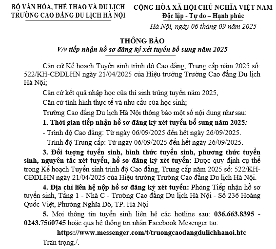 Thông báo V/v tiếp nhận hồ sơ đăng ký xét tuyển bổ sung năm 2025
